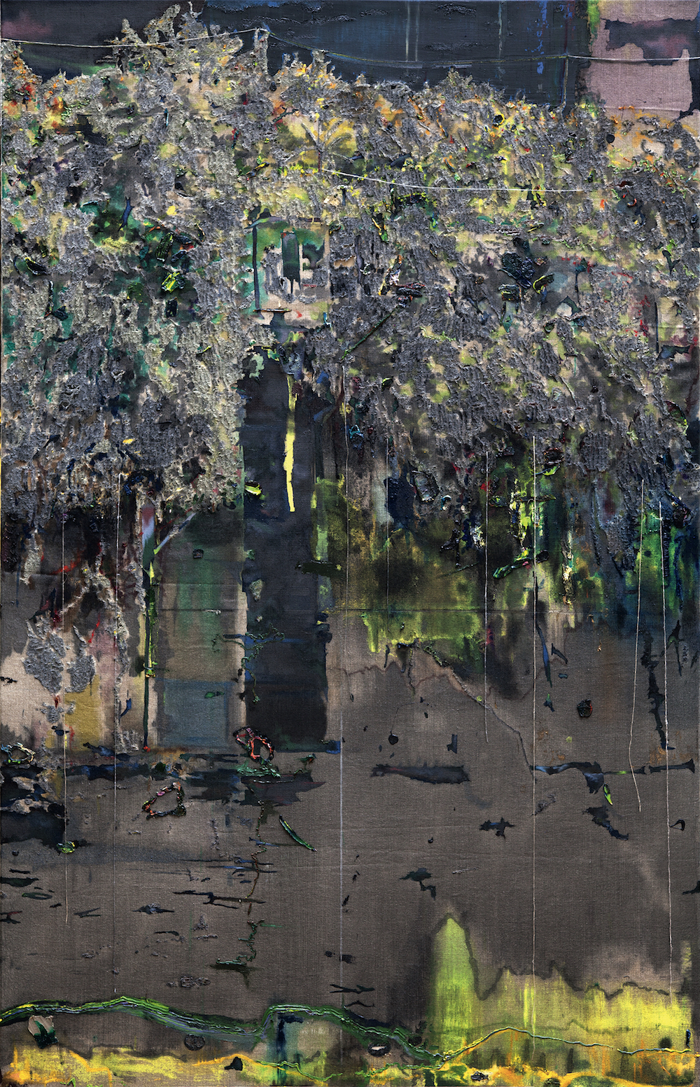 soft pastels,oil, oilskins, and linen yarn on partial primed linen